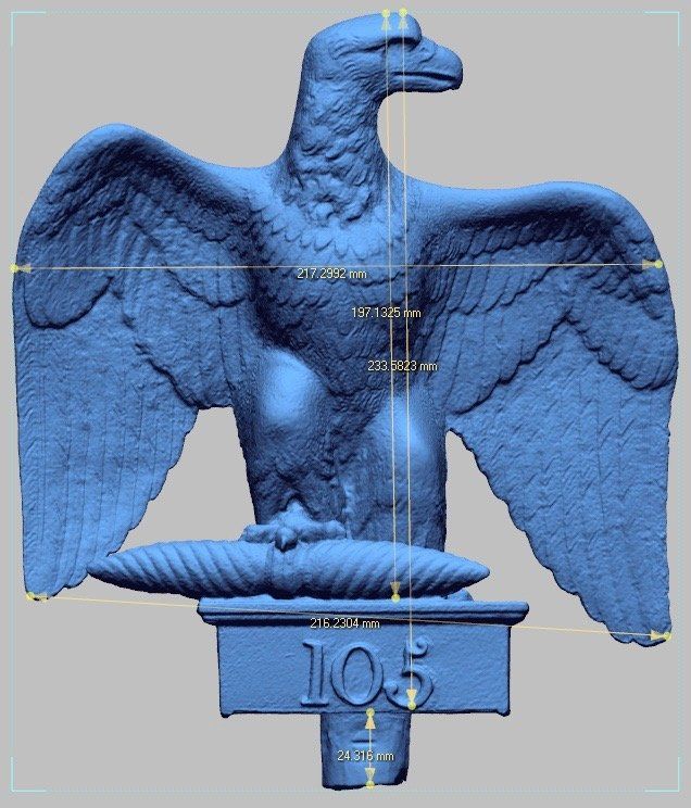 On the 18th June 1815 Napoleon was defeated by the combined British, Prussian and Netherlands armies. During the heat of the battle 2 imperial eagles were captured. Sergeant Ewart of the Scot Greys captured one from Napoleon’s Elite Imperial 45th infantry. The eagle now rests at the Royal Scots Dragoon Guards Museum at Edinburgh Castle. With kind permission of the RSDG the eagle underwent multiple forensic 3D scanning.